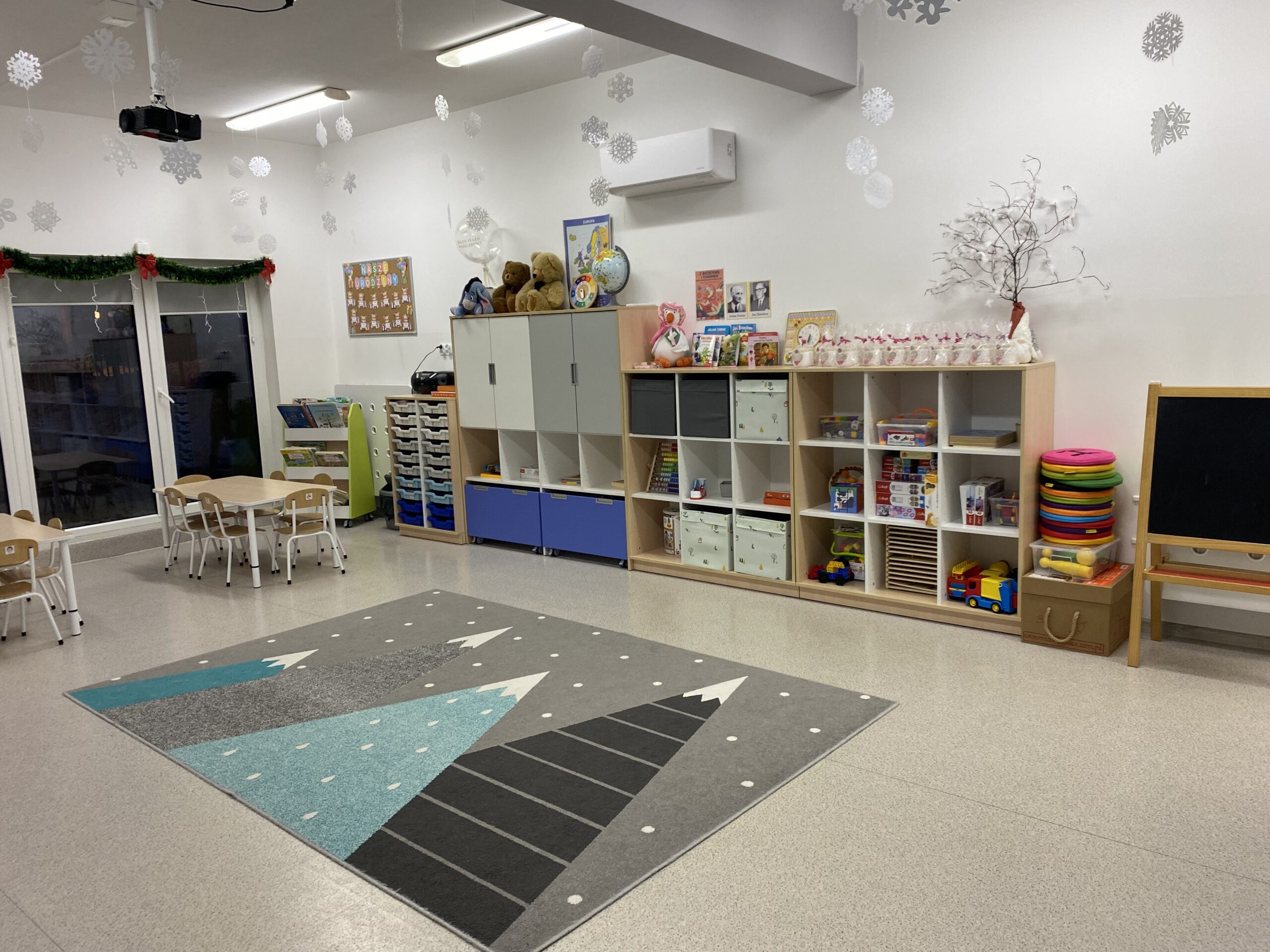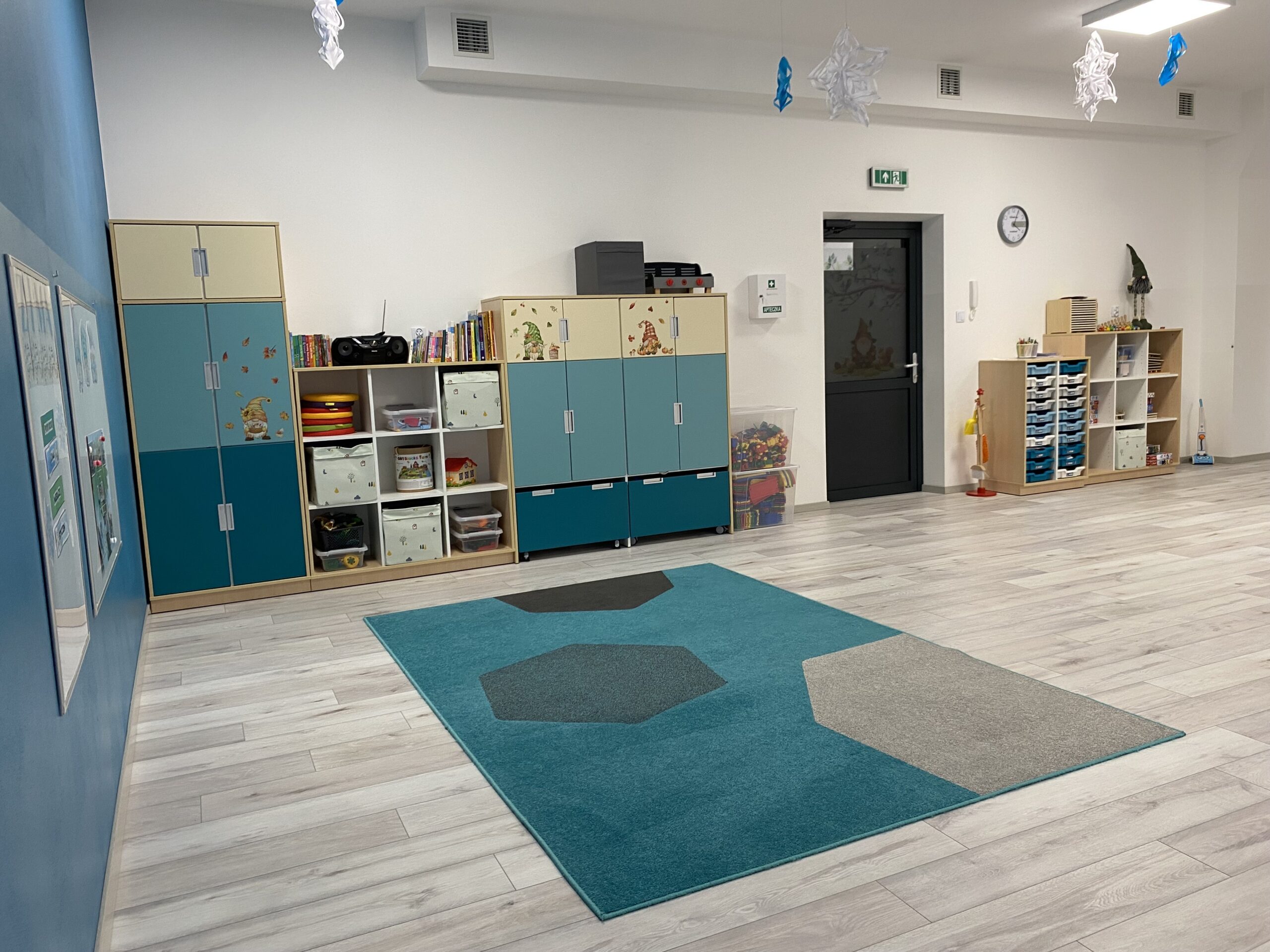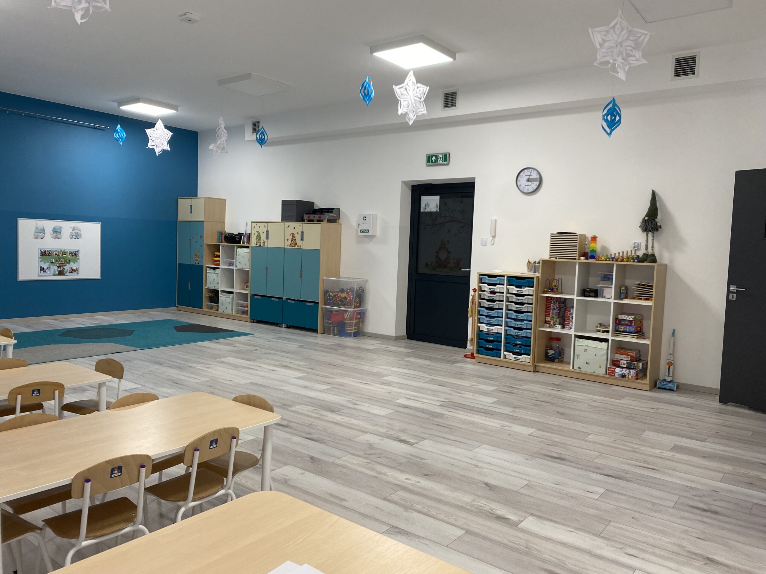 Dysponujemy czterema nowoczesnymi salami, z których każda posiada własne zaplecze sanitarne dostosowane do potrzeb dzieci. Aranżacja przestrzeni umożliwia podejmowanie różnorodnych aktywności. Sale wyposażone są w zabawki i pomoce dydaktyczne, które wspierają samodzielne działanie dzieci, rozwijanie ciekawości poznawczej, utrwalanie zdobytej wiedzy i umiejętności oraz inspirowanie do własnych doświadczeń i eksperymentów. Dbamy o najwyższy standard techniczny – pomieszczenia posiadają wentylację mechaniczną nawiewno-wywiewną oraz klimatyzację, co zapewnia komfortowy mikroklimat przez cały rok. Każda z lokalizacji dysponuje własnym placem zabaw, wyposażonym m.in. w huśtawki, karuzele, piaskownicę oraz ławki, co sprzyja bezpiecznej aktywności ruchowej na świeżym powietrzu.